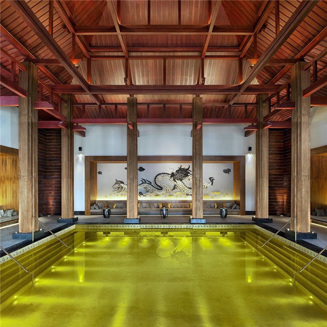 Bể bơi Gold Energy, khu nghỉ dưỡng St. Regis, Tây Tạng, Trung Quốc: Nằm trong khu nghỉ dưỡng St. Regis sang trọng, bể bơi được dát vàng 14 cara này khiến bạn có cảm giác như mình là vua chúa, hoàng tộc thời xưa. Nhiệt độ trong bể được duy trì ở mức lý tưởng cho cơ thể bạn thư giãn. Ảnh: St. Regis.