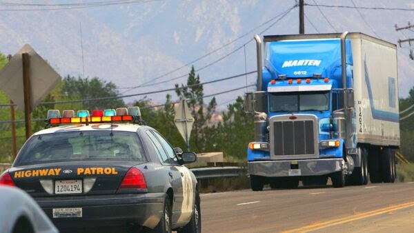 Một tài xế xe tải tiến đến gần một xe cảnh sát tuần tra đường cao tốc vào ngày 23/7/2007, gần Wrightwood, California, 50 dặm về phía đông bắc của Los Angeles. (Ảnh của David McNew / Getty Images)