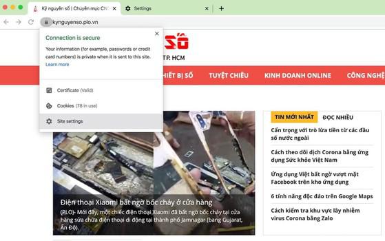Trong trường hợp bạn sử dụng trình duyệt Chrome trên máy tính thì có thể truy cập cập vào trang web cần chặn quảng cáo, sau đó bấm vào biểu tượng ổ khóa ở trước địa chỉ (đối với những trang sử dụng HTTPS) hoặc tùy chọn Not Secure (đối với những trang sử dụng HTTP) và chọn Site Settings.