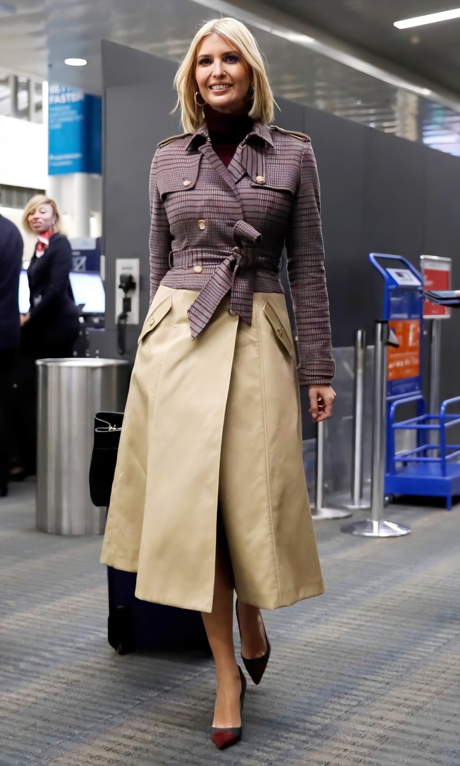 Ivanka phối đồ mùa thu với áo khoác màu hạt dẻ của Armonia khi đến sân bay Dulles hồi tháng 11/2019. Ái nữ nhà Trump phối chân váy da, giày cao gót từ thương hiệu cô làm chủ và túi Chanel đen. Ảnh: AP/Shutterstock.