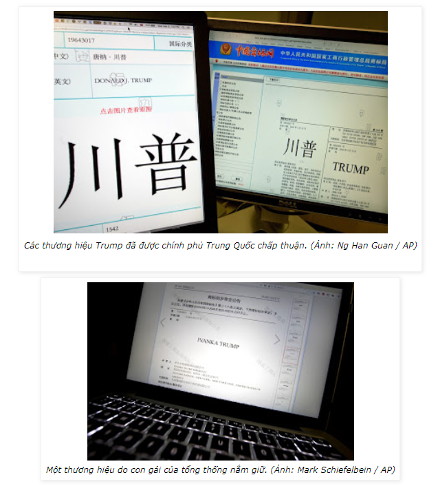 Tựa như ở Nga, nơi ông đã thăm dò các dự án khách sạn và tòa tháp ở Moscow mà không thành công, ông Trump từ lâu đã tìm kiếm một thỏa thuận cấp phép thương hiệu ở Trung Quốc. Những nỗ lực của ông ít nhất là từ năm 2006, khi ông nộp đơn đăng ký thương hiệu ở Hồng Kông và đại lục. Nhiều sự chấp thuận của chính phủ Trung Quốc đã được đưa ra chỉ sau khi ông trở thành tổng thống. (Con gái của tổng thống Ivanka Trump cũng giành được sự chấp thuận các thương hiệu tại Trung Quốc cho doanh nghiệp của riêng cá nhân cô sau khi cô ta vào làm việc tại Nhà Trắng.)