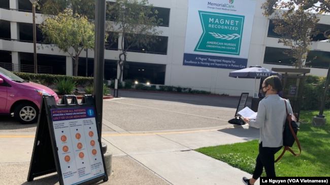 Ngay trước bệnh viện Orange Coast, nơi ông Định làm việc, là một tấm bảng bằng cả ba thứ tiếng Anh, Việt và Tây Ban Nha cảnh báo những triệu chứng nhiễm Covid-19.