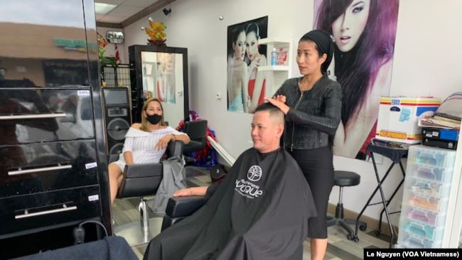 “Nếu khẩu trang có hiệu quả th́ tại sao phải giăn cách, nếu giăn cách có hiệu quả th́ tại sao cần phong tỏa?” cô lập luận với chúng tôi khi đang hớt tóc cho khách ngay tại tiệm của cô. Cả cô và khách hàng đều không đeo khẩu trang.