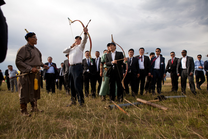 Thủ tướng Mông Cổ Sukhbaatar Batbold (mặc vest đen, cầm cung) nhìn cựu Phó Tổng thống Joe Biden bắn tên trong một màn giao lưu văn hóa ở vùng ngoại ô Ulaanbaatar, Mông Cổ, ngày 22/8/2011. Ảnh: David Liennemann/White House Official