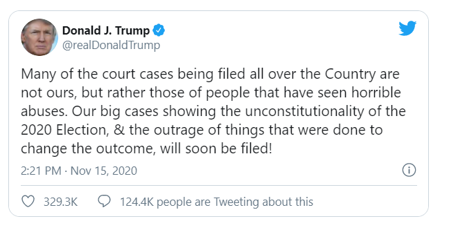 Vào tối Chủ nhật, Trump tuyên bố có thể sẽ có thêm hành động pháp lý, tweet rằng "các vụ kiện lớn của chúng tôi" sẽ sớm được đệ trình, khi các bang đang chạy đua với thời hạn chứng nhận kết quả trong cuộc bầu cử ngày 3 tháng 11. Đối với Pennsylvania, ngày đó là ngày 23 tháng 11.