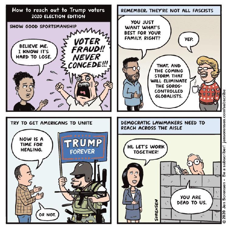 Không ai mấy ngạc nhiên khi thấy Tổng thống Donald Trump, vào đêm 3 tháng 11, mang Phó Tổng thống Mike Pence và toàn thể, vợ và cả con cái trong gia đình của ông ra mắt quần chúng và tuyên bố là ông thắng cử nhiêm kỳ hai lúc 1:45 AM ngày 4-11, mặc dầu ông dư biết lúc đó số phiếu cử tri đoàn của ông Joe Biden là 234 phiếu, và của ông chỉ có 210 phiếu, và công cuộc đếm phiếu vẫn đang tiếp diễn trên hầu hết các tiểu bang.