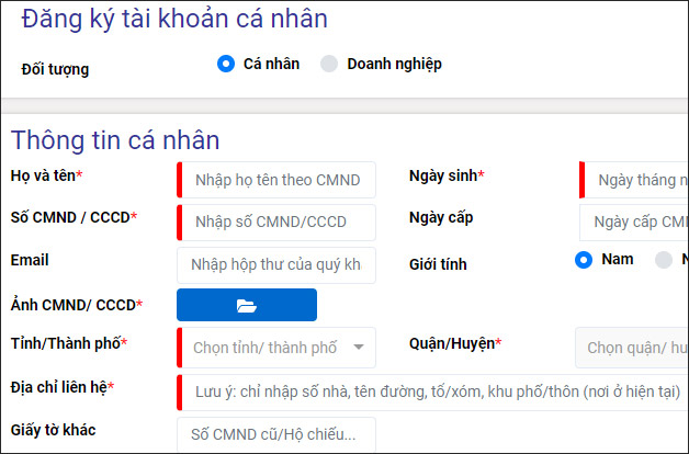 Chuyển sang giao diện đăng ký tài khoản cá nhân. Chúng ta sẽ chọn đăng ký Doanh nghiệp hay Cá nhân. Giao diện đăng ký tài khoản cá nhân như hình dưới đây. Tại đây bạn sẽ cần điền tất cả thông tin được yêu cầu, chụp 3 ảnh chứng minh nhân dân hoặc căn cước công dân (CMND/CCCD) theo định dạng png, jpg, jpeg bao gồm: ảnh mặt trước, mặt sau CMND/CCCD và ảnh chân dung bản thân có kèm CMND/CCCD.