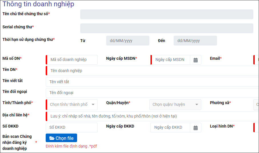 Với Doanh nghiệp thì chúng ta cũng cần điền đầy đủ thông tin được yêu cầu như trong giao diện.