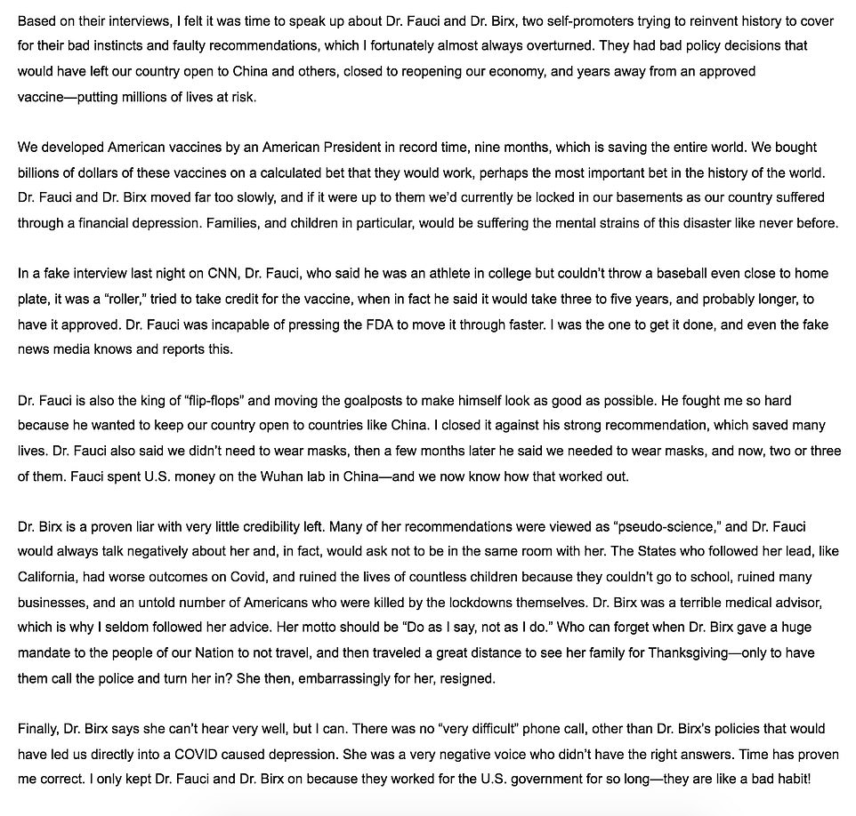 Tuyên bố gây nhức nhối của anh ấy được đưa ra sau khi Fauci và Birx đều xuất hiện trên CNN vào Chủ nhật, với Birx nói về sự hối tiếc của cô ấy với tư cách là trưởng lực lượng đặc nhiệm COVID của Nhà Trắng, và Fauci xuất hiện để tuyên bố công nhận cho quyết định nhanh chóng phát triển vắc-xin chống lại COVID-19.