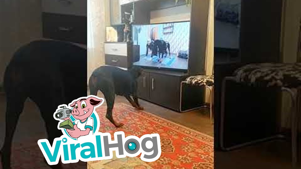 Chó nhà tập thể lực theo hướng dẫn trên tivi. Chú chó làm thuần thục các động tác được hướng dẫn. Xem clip có thể thấy chú chó chăm chú ra sao các bài tập trên tivi.