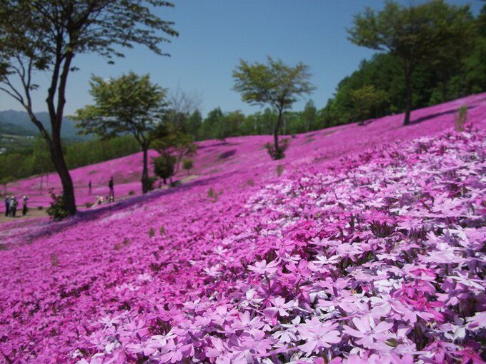 Loài hoa màu hồng mọc và nở thành thảm lớn này có tên là chi anh (shibazakura), thường rộ vào cuối xuân đầu hè, khoảng giữa tháng 4 đến cuối tháng 5 hàng năm. Thời gian nở kéo dài nhưng những ngày ngắm hoa đẹp nhất sẽ rơi vào 2 - 3 tuần đầu tháng 5. Năm nay hoa chi anh nở sớm hơn, ước tính có tới 800.000 cây khoe sắc. Ảnh: VCG