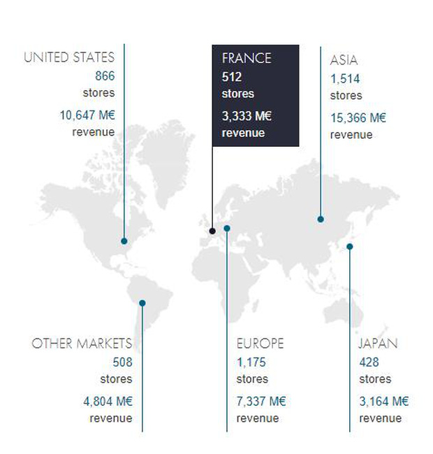 LVMH có độ phủ sóng rộng lớn trên toàn cầu, khi có cửa hàng tại rất nhiều nơi trên thế giới; trong đó, khu vực châu Á, đặc biệt là Nhật Bản, là thị trường đem lại nguồn thu lớn nhất cho công ty trong nhiều năm trở lại đây. Nếu tính cả nước Nhật, thị trường châu Á đem lại khoảng trên 40% doanh thu năm 2020 cho LVMH, với gần 2000 cửa hàng trên toàn khu vực. Mỹ cũng là một thị trường mũi nhọn của hãng, khi nhiều người nổi tiếng tại đất nước này sẵn sàng chi ra hàng triệu USD chỉ để sở hữu những món đồ bản giới hạn (limited) của những hãng thời trang thuộc sở hữu của tập đoàn này.