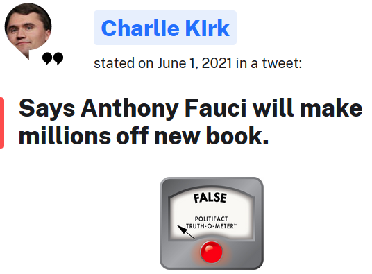 "Tony Fauci will make millions off of a new book about ‘Truth’ while Americans continue to suffer because of his endless stream of lies over the past year," reads a June 1 tweet by Charlie Kirk, the founder of the conservative nonprofit Turning Point USA. "The highest paid employee of the federal government is set to profit even more off this pandemic. What a disgrace."