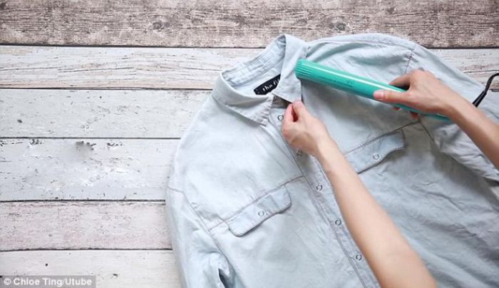 Chắc bạn chưa bao giờ nghĩ tới việc xóa bất kỳ nếp nhăn nhỏ nào trên áo sơ mi hoặc vùng cổ áo bằng máy duỗi tóc? Tốt nhất nên lựa chọn máy duỗi tóc có thể đặt được nhiệt độ vì chúng còn phụ thuộc vào từng chất liệu vải. Ngoài ra, bạn có thể dùng một miếng vải mỏng để đè lên một lớp áo khác trước khi dùng máy duỗi để ủi, tránh làm áo bị hư hỏng. Vải tiếp xúc của máy ép tóc tương đương với mặt tiếp xúc với bàn là, nhưng nhỏ hơn. Do vậy rất tiện lợi và dễ dàng mang theo mọi lúc, mọi nơi.