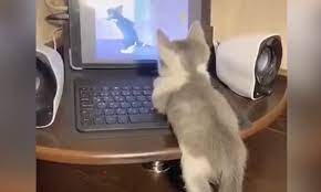 Mèo thích thú xem phim 'Tom và Jery'. Được chủ mở máy tính cho xem, con mèo chăm chú theo dõi bộ phim mà mình yêu thích.