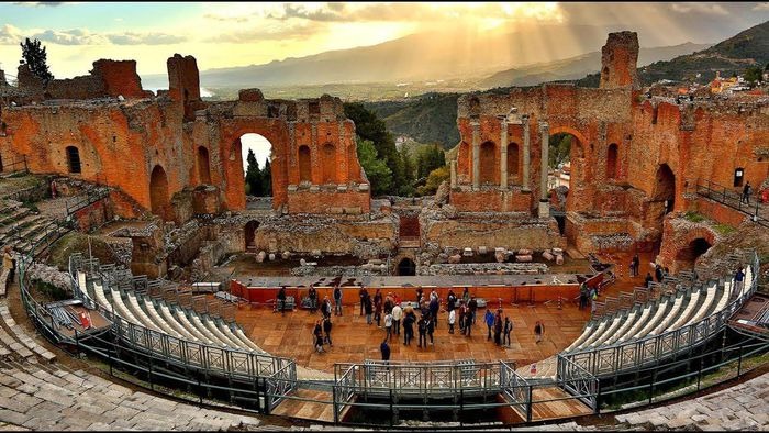 Nhà hát Taormina nằm trên biển Địa Trung Hải và cạnh núi lửa Etna. Đây từng là nơi diễn ra các sự kiện văn hóa quan trọng của người Hy Lạp cổ đại. Nhà hát được xây dựng vào năm 300 TCN, trước khi người La Mã tu sửa lại vào thế kỷ 2 TCN. Ảnh: Greekreporter.