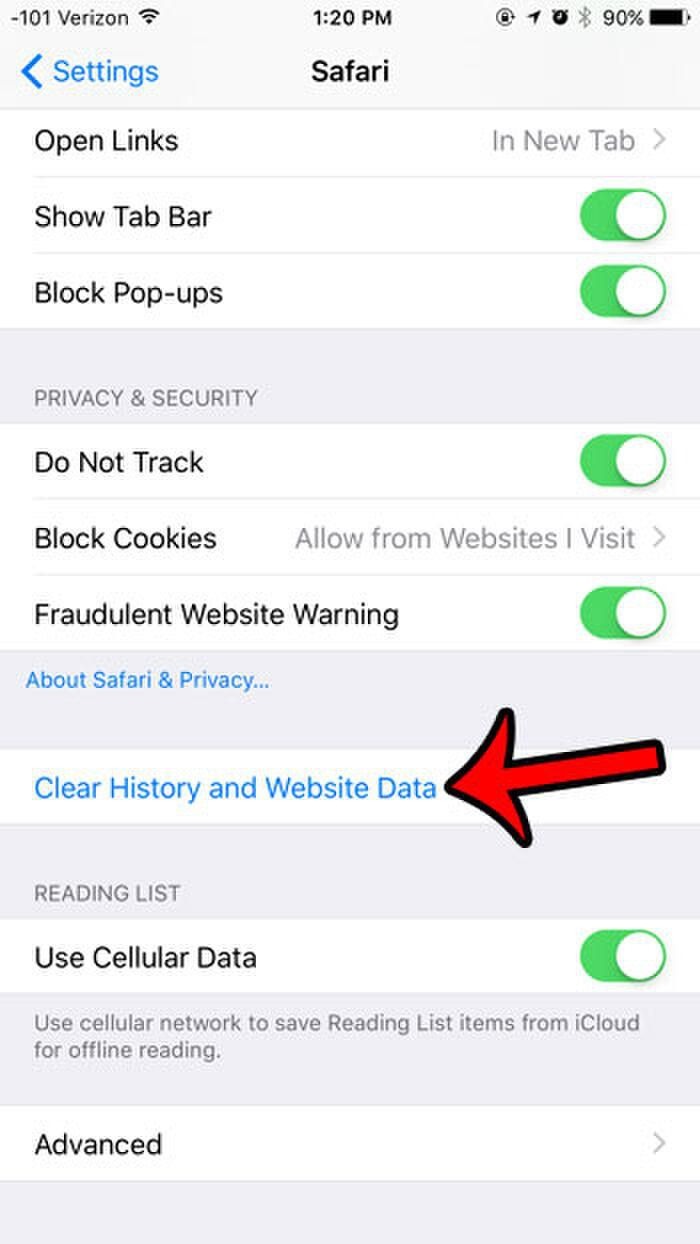 Nếu mỗi lần sử dụng Safari khiến máy bị đơ, hoặc load dữ liệu chậm, bạn cần phải dọn dẹp cho trình duyệt web này. Để làm "mới" Safari, bạn có thể truy cập Settings > Safari > nhấn vào clear History and Website Data.