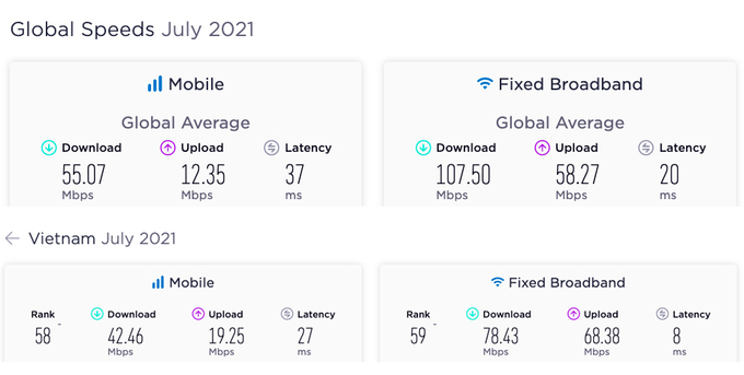 Theo dữ liệu mới công bố của Speedtest, tốc độ tải xuống của mạng di động tại Việt Nam đạt 42,46 Mb/giây trong tháng 7, thấp so với mức trung bình thế giới là 55,07 Mb/giây. Với Internet băng rộng cố định, Việt Nam đạt tốc độ tải xuống 78,43 Mb/giây, kém xa chỉ số 107,50 Mb/giây trên thế giới.