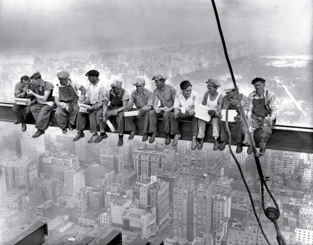 Bức ảnh được chụp vào ngày 20/9/1932 trên tầng 29 của tòa nhà chọc trời RCA giữa thành phố New York. Bức ảnh khiến người xem thán phục nhưng cũng thót tim không kém. Trong ảnh, những người công nhân xây dựng đang ngồi ăn chưa trên những xà ngang mà không hề có biện pháp bảo hộ an toàn.