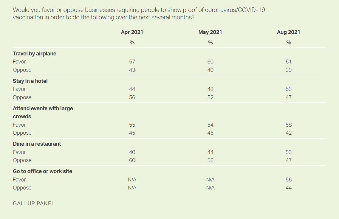 Gallup surveyed more than 3,500 random adults between August 16-22 on a variety of vaccine mandates. Results showed 61% of Americans favor vaccination requirements for air travel, 53% of respondents support vaccine proof for dining out, and 56% of those polled support mandates for their office or work settings.