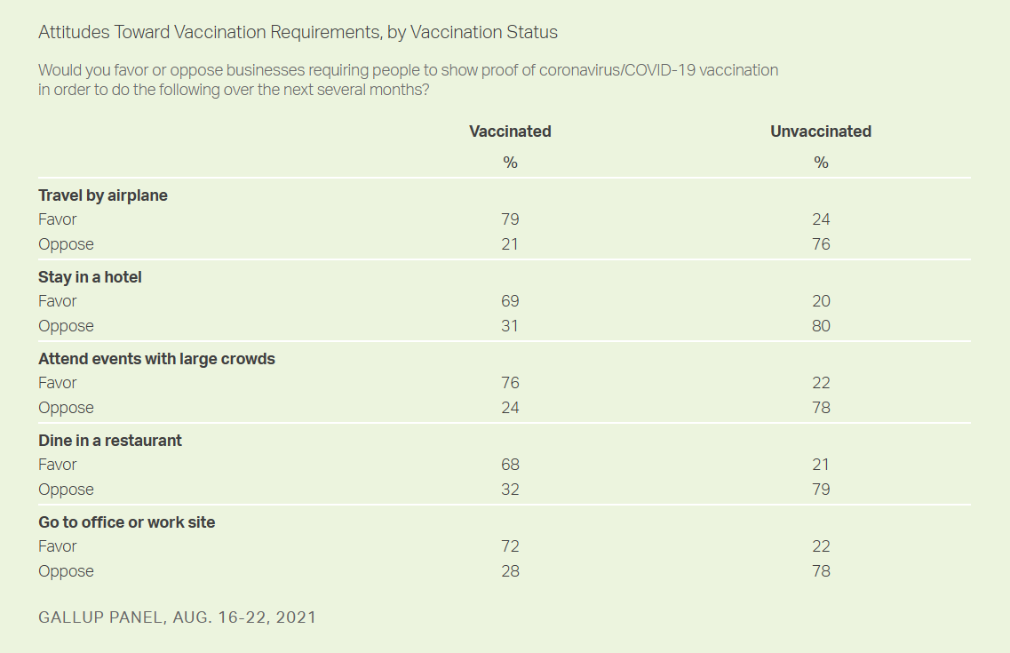 “In short, if it came to a national referendum, these vaccination proof requirements would win — but with significant opposition,” reports Gallup researcher Frank Newport.