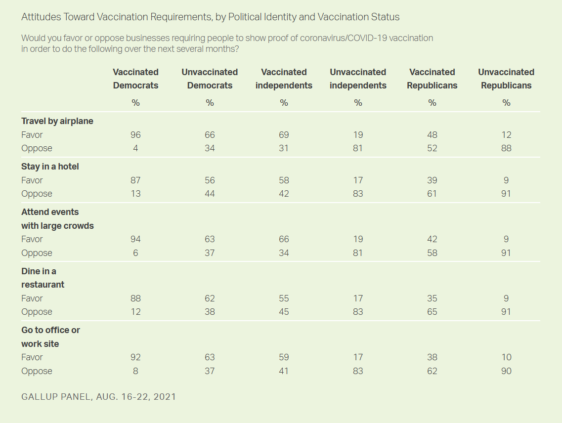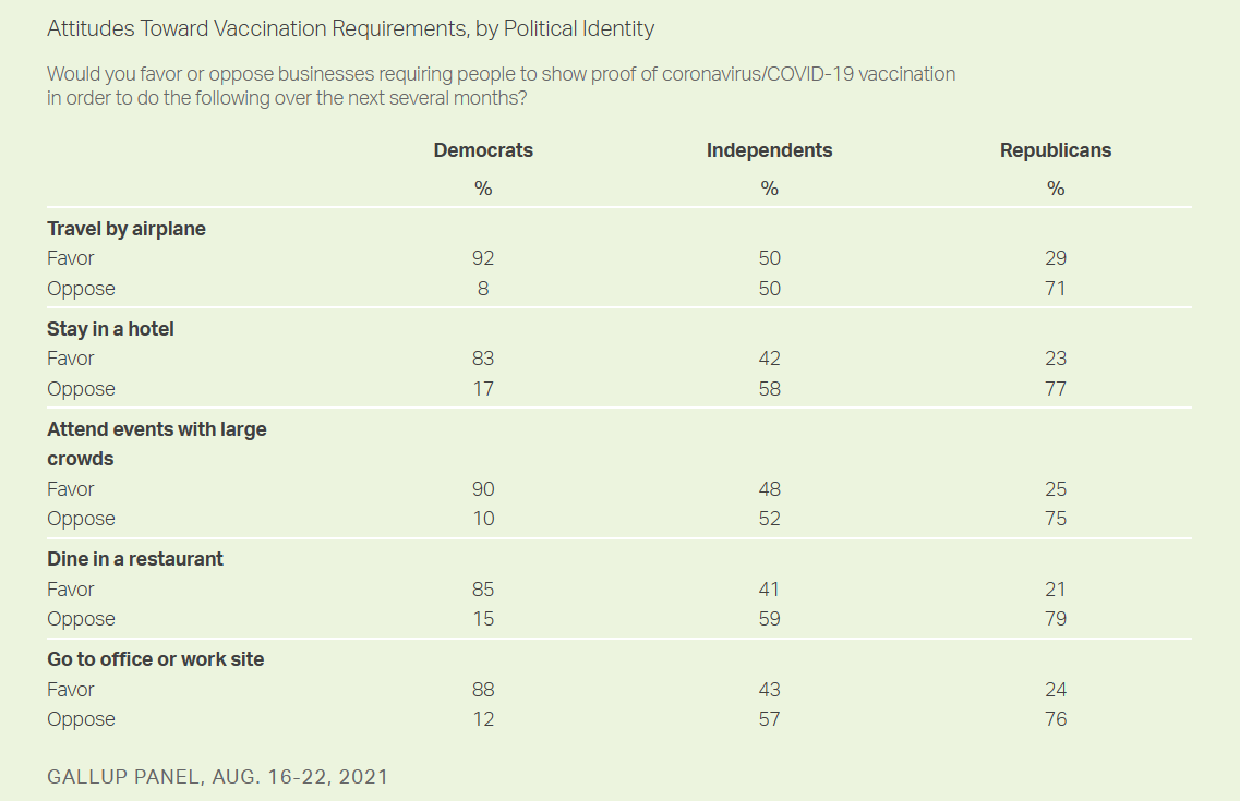 For example, 92% of Democrats polled by Gallup support vaccination mandates to board an airplane, while just 29% of Republicans do. Independents were evenly split, with 50% supporting and 50% opposing.