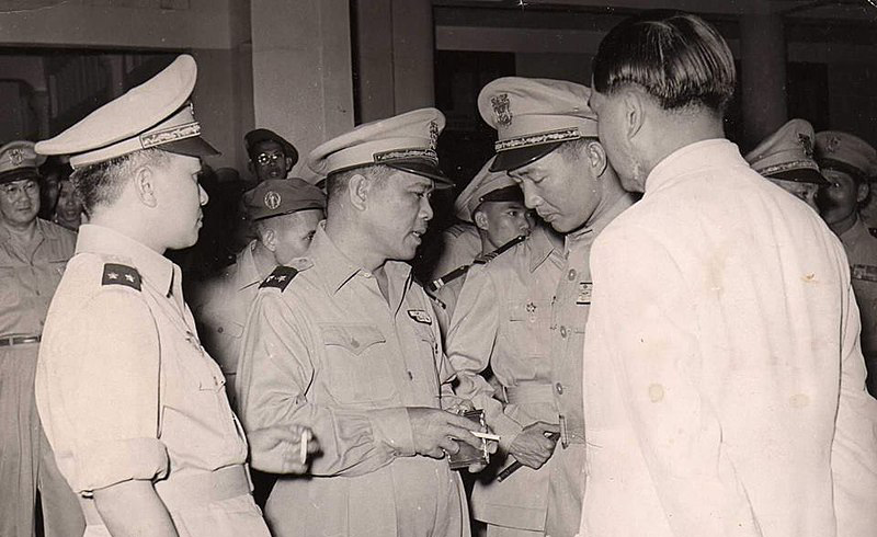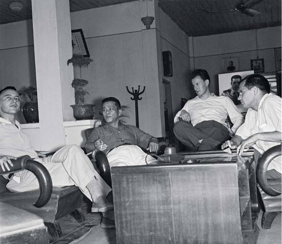 Bảy Viễn (vị trí thứ hai từ trái sang) trò chuyện với tướng Nguyễn Văи Hinh trong cuộc gặp