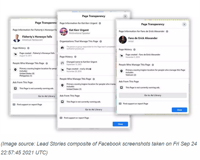 t's not clear exactly how many people are involved in this spam network, but the tactics are repeated by many pages and also seen in posts in groups run by the same network. Many of the pages show connections to Vietnam, Indonesia and the Philippines. Many of the pages and profiles used in the network show signs that they were hacked or hijacked. Stealing an active account of a person or a business can be used to lend credibility to the foreign network's activity or to hide the network's origin.
