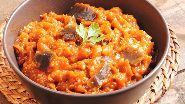 5. Zaalouk Zaalouk là một món salad truyền thống của Ma-rốc, được làm từ cà tím, cà chua, tỏi và các hương liệu như thìa là, ớt bột, rau mùi và mùi tây. Nó thường ăn riêng nhưng cũng được phục vụ như món ăn phụ như phết cùng với bánh mì nóng giòn.