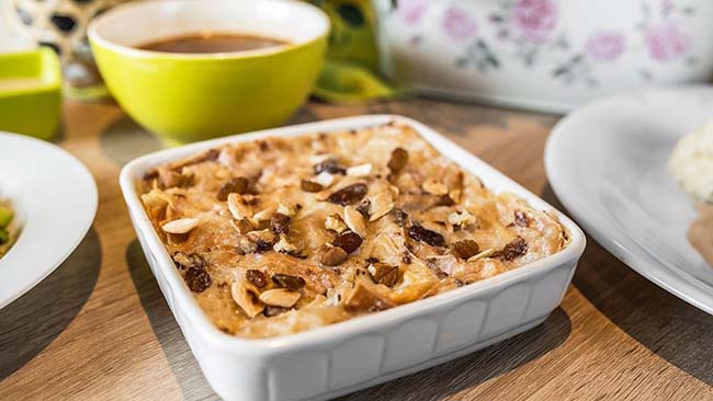 8. Umm ali Mặc dù có nhiều công thức nhưng món umm ali của người Ai Cập thường được làm bằng cách chia bánh mì hoặc bánh phồng thành từng miếng, sau đó trộn với đường, sữa và dừa bào sợi. Hỗn hợp này thường được rắc nho khô, hạt dẻ cười và quế, sau đó nướng trong lò cho đến khi phần trên chuyển sang màu vàng nâu.