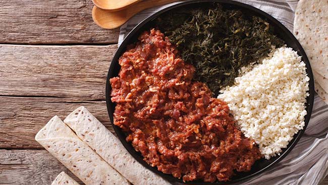 15. Kitfo Kitfo là một món ăn phổ biến ở Ethiopia, bao gồm thịt bò tươi xay nhuyễn kết hợp với bơ Ethiopia và các loại gia vị như ớt, muối. Món ăn này được phục vụ với nhiều loại bánh mì khác nhau, pho mát mặn và rau xanh.