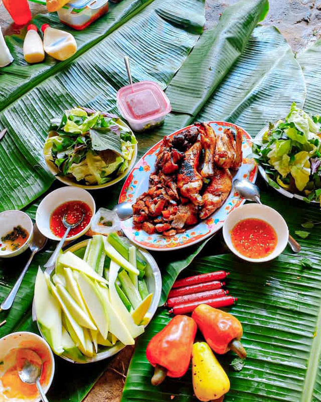 Cùng bạn bè, người thân thưởng thức món gà nướng và trái cây như điều lộn hột, xoài sẽ mang lại cảm giác thú vị cho chuyến đi.