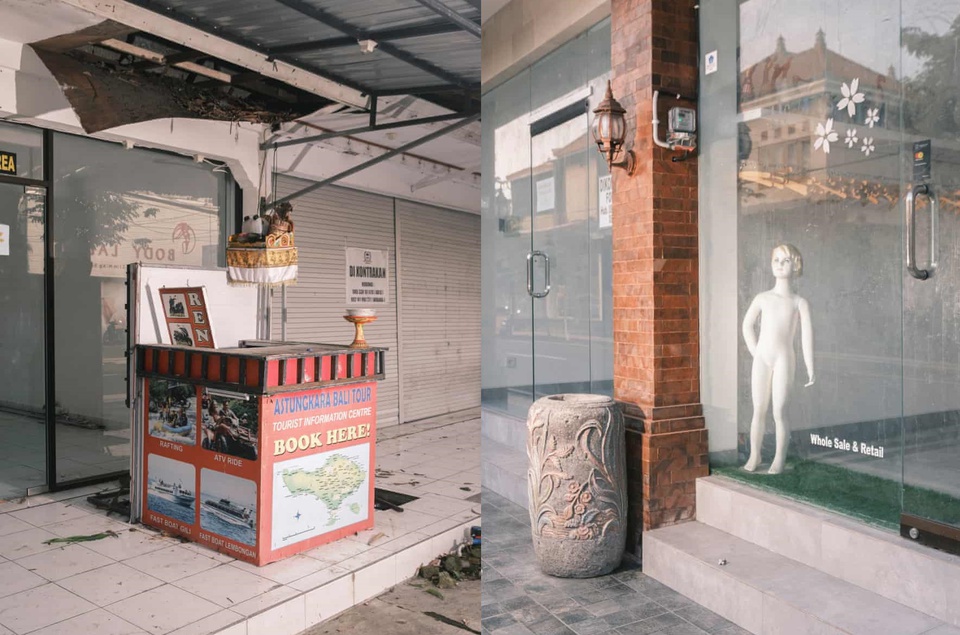 Bên trong các cửa hàng thời trang, không có dấu hiệu gì của hoạt động kinh doanh. Những chiếc ma nơ canh không còn mảnh vải trên người, bị bỏ lại bên cạnh những quầy hàng trống không. Các quán bar, câu lạc bộ đêm hoàn toàn vắng lặng, trái ngược với không khí nhộn nhịp bất tận thường thấy của Bali. Ảnh: Guardian.