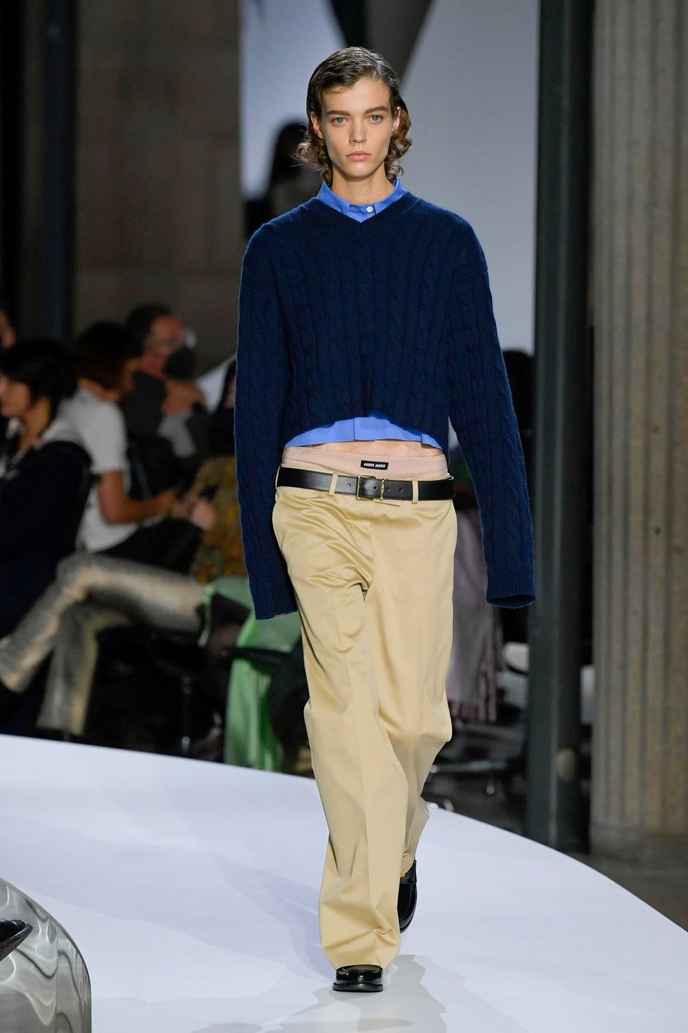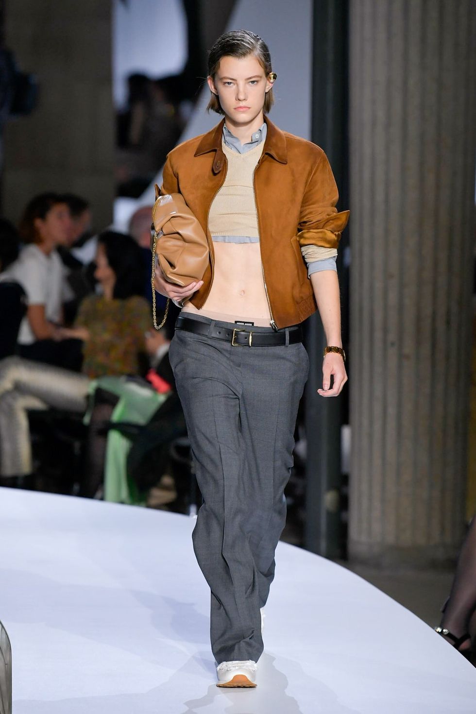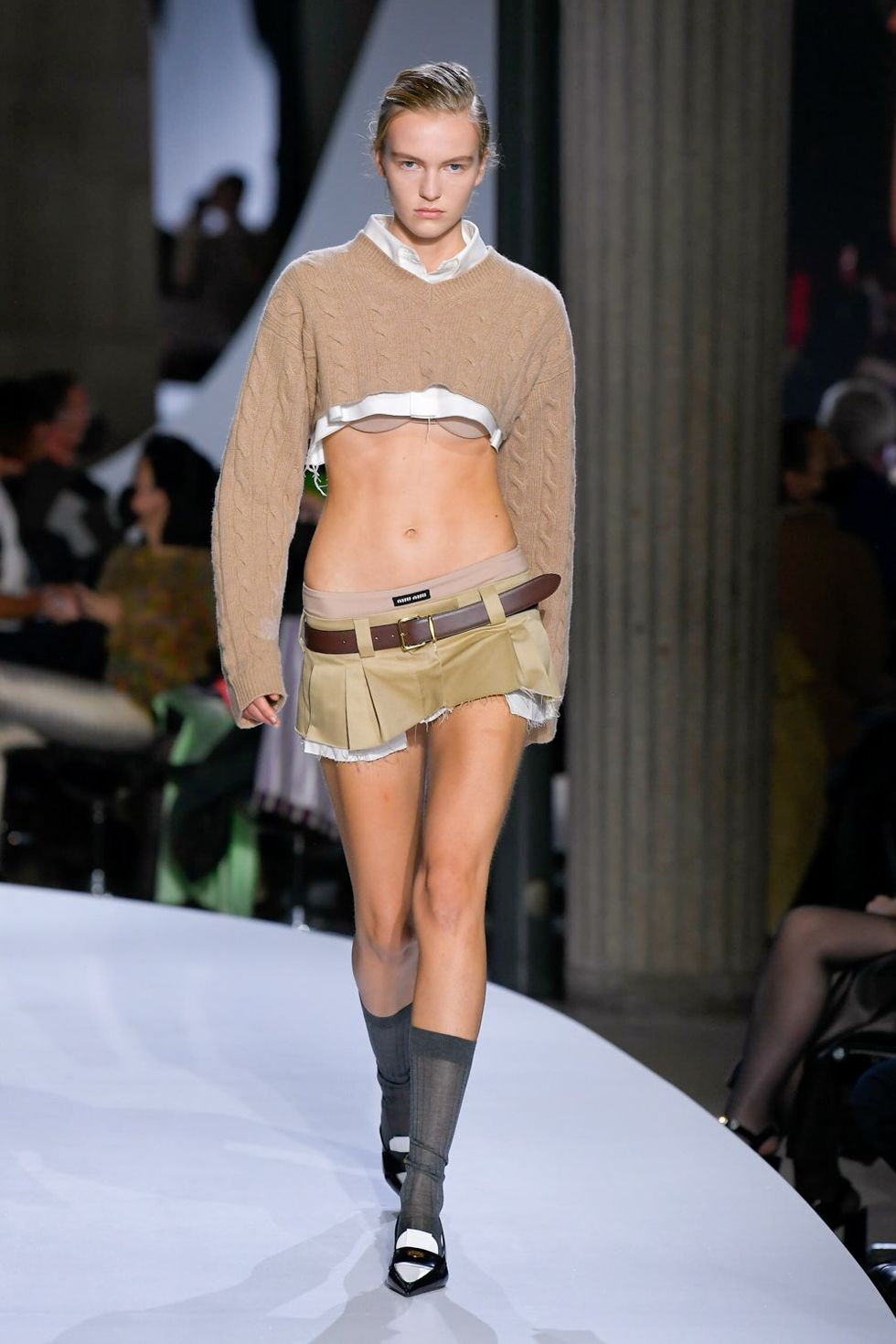 Với buổi trình diễn mới nhất cho công ty chị em của mình, Giám đốc Sáng tạo Miuccia Prada đã kết hợp khéo léo hot trend khoe eo với những trang phục cổ điển của nhà mốt và xu hướng hiện tại. Một loạt những chiếc váy ngắn cũn cỡn xuất hiện trên sàn diễn khiến người xem nhớ đến chiếc váy siêu nhỏ khó quên của Christina Aguilera trong VMAs 2002. Những chiếc váy này được kết hợp với quần tây cắt cúp và áo sơ mi có cổ, tôn lên chiều sâu của vòng một. Đồng thời, quần ống rộng và quần đùi xuất hiện nhiều lần, đưa xu hướng đầu những năm 2000 thoát khỏi gu thẩm mỹ “Dirrty” của Aguilera và trở thành một bộ trang phục trang trọng hơn.