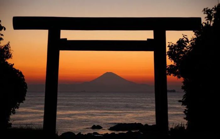 Vào buổi chiều, hình ảnh núi Phú Sĩ nổi trên mặt biển nằm gọn trong cổng đền thờ tạo nên một khung cảnh đẹp như tranh vẽ. Ngọn hải đăng Sunosaki dẫn lối vào vịnh Tokyo là một nơi tuyệt vời để bạn có thể ngắm nhìn núi Phú Sĩ, núi Amagi và đảo Izu Oshima.