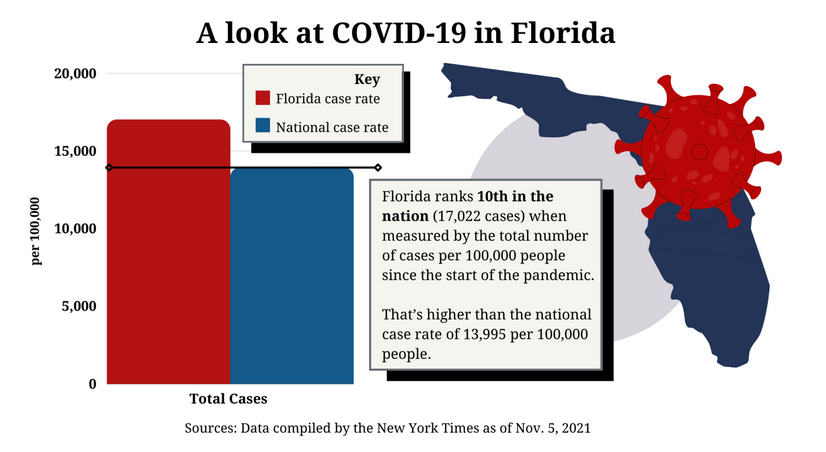 In early November, the U.S. surpassed 750,000 deaths due to COVID-19 and has had more than 46 million cases since the pandemic began. Florida has the 10th highest cumulative case rate of the pandemic, according to federal, state and local data compiled by the New York Times.