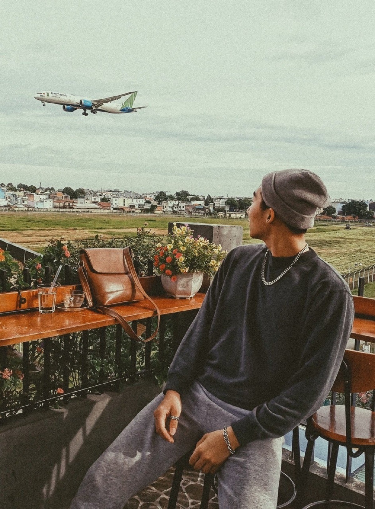 Landing - Milk Tea and Coffee ở địa chỉ 138, Nguyễn Văn Công, phường 3, quận Gò Vấp. Quán cà phê với không gian mở 4 tầng có nhiều cây xanh và góc chụp ảnh hoa lá. Nơi này còn hút khách vì có thể ngắm máy bay hạ cánh ở cự ly gần trên đường băng. Ảnh: Quán cà phê