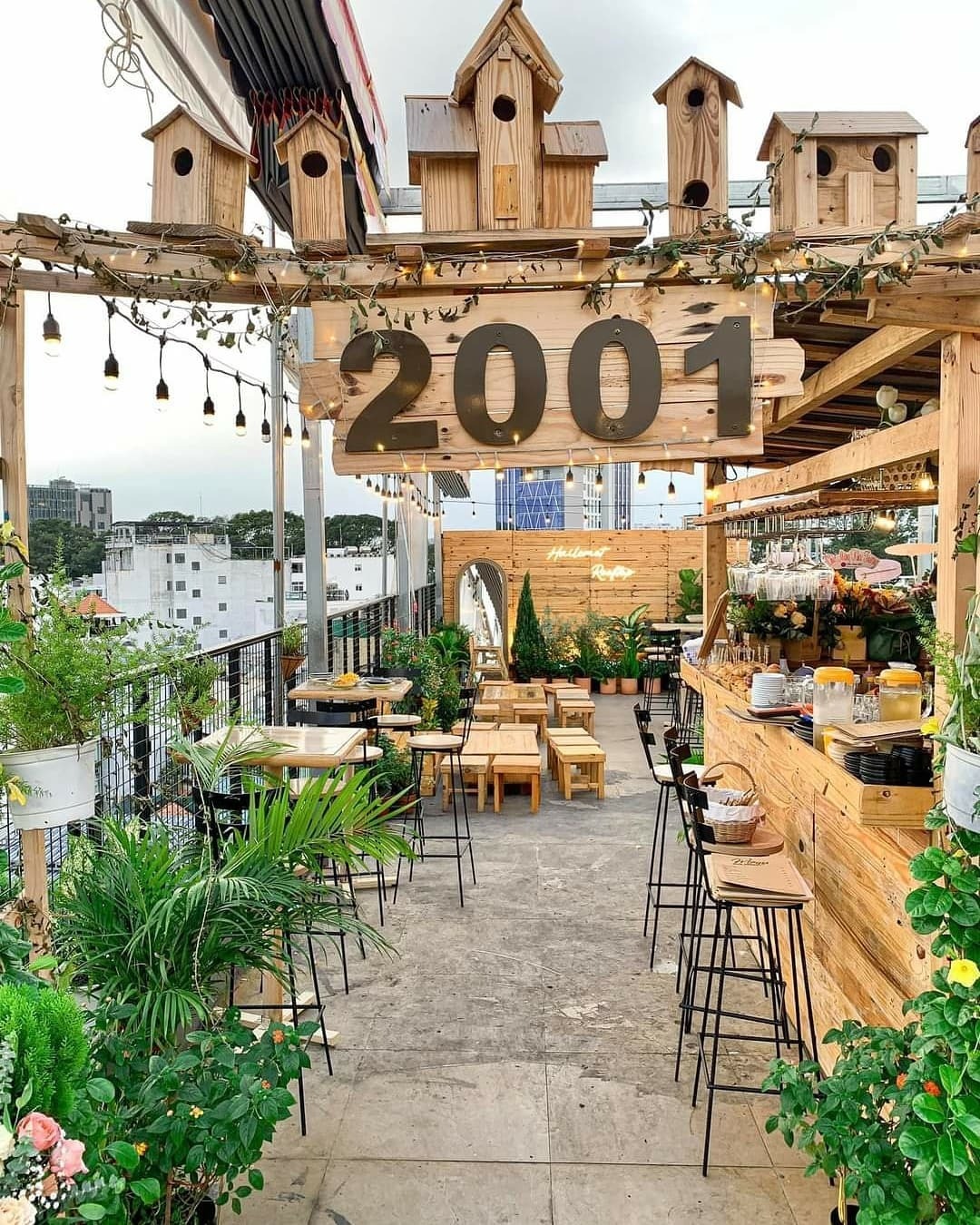 Hai Lẻ Một Rooftop là quán bán cà phê, cocktail, đồ ăn nhẹ để khách nhâm nhi ngắm hoàng hôn tại tầng 7, số 9, Võ Thị Sáu, phường Đa Kao, quận 1. Không gian được trang trí với nhiều cây cỏ hoa lá nhỏ nhắn, kết hợp với bàn ghế bằng gỗ mang lại cảm giác rất thiên nhiên. Ảnh: Instagram hquanfood