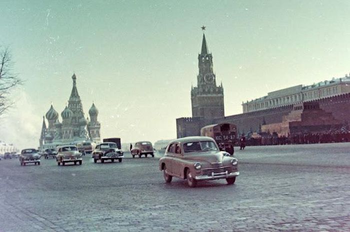 Những chiếc xe hơi Liên Xô sản xuất chạy qua lăng lãnh tụ Lenin ở Quảng trường Đỏ.