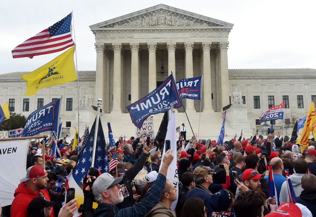 Những người ủng hộ Tổng thống Hoa Kỳ Donald Trump trong cuộc diễu hành MAGA với sự tham gia của hàng triệu người để phản đối kết quả của cuộc bầu cử tổng thống năm 2020, trước Tòa án Tối cao Hoa Kỳ vào ngày 12/12/2020 tại Washington, DC. (Ảnh của Olivier DOULIERY / AFP) (Ảnh của OLIVIER DOULIERY / AFP qua Getty Images).