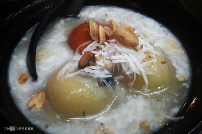 Chè trôi nước hay bánh trôi là món ăn phù hợp với mùa lạnh hơn mùa nóng vì đồ nếp thường khiến cho người ta có cảm giác ấm bụng. Trong một bát chè thường có ba viên trôi nước: nhân đậu xanh, nhân vừng đen và nhân vừng dừa với giá 15.000 - 20.000 đồng. Bát chè nóng hổi "vừa thổi vừa ăn" với ba viên nhỏ, rắc thêm lạc rang, dừa nạo và chút cốt dừa béo bùi cũng đủ để bạn bớt thèm cái ngọt lành giữa mùa đông lạnh. Bánh trôi rất dễ tìm, bạn chỉ cần để ý các hàng chè mùa hè bán chè lạnh, mùa đông thường đổi sang bán chè trôi nước trên các phố Bát Đàn, Đội Cấn, Văn Cao, đê Tô Hoàng... Ảnh: Khánh Trần