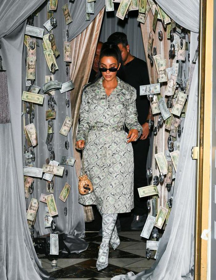 Kim Kardashian mặc thiết kế vô cùng bắt mắt đến dự tiệc mừng thương hiệu Anastasia Beverly Hills. Bộ đồ lẫn phụ kiện được dát tiền từ đầu đến cuối như khẳng định độ giàu có của chính chủ.