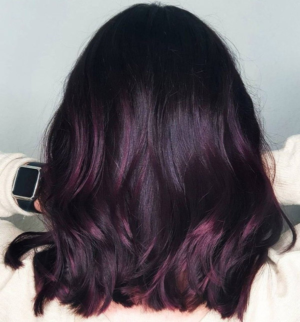 Nếu ưa sự đơn giản, chị em nên nhuộm kiểu tóc tím mận pha đen này.