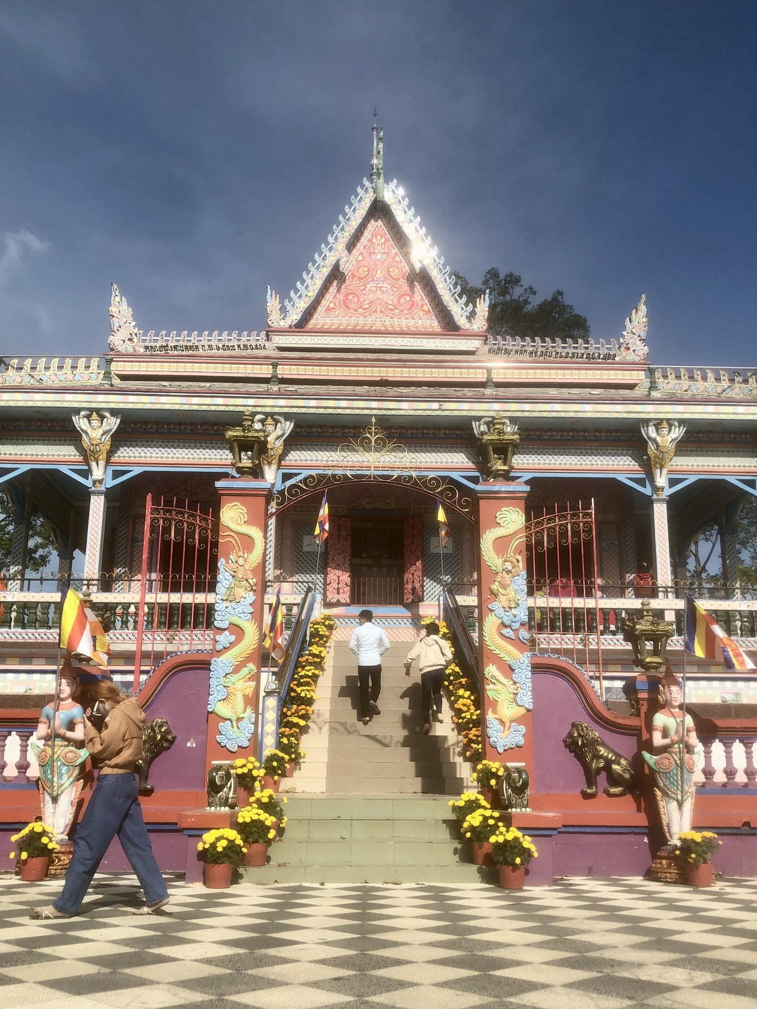 Cột cờ giữa sân với hình ảnh thần rắn Nagar xòe 5 đầu nhằm nhắc nhớ một sự tích trong Phật giáo