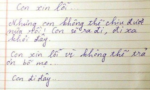 Khi bố mẹ đọc lá thư này, con đã ở một nơi rất xa. Con vô cùng buồn và hối hận, nhưng con vẫn phải quyết định ra đi theo tiếng gọi của tình yêu, con đã 14 tuổi rồi. Anh Tráng, bạn trai mới quen trên Facebook của con cũng không muốn bố mẹ buồn nên bảo con viết lá thư này.