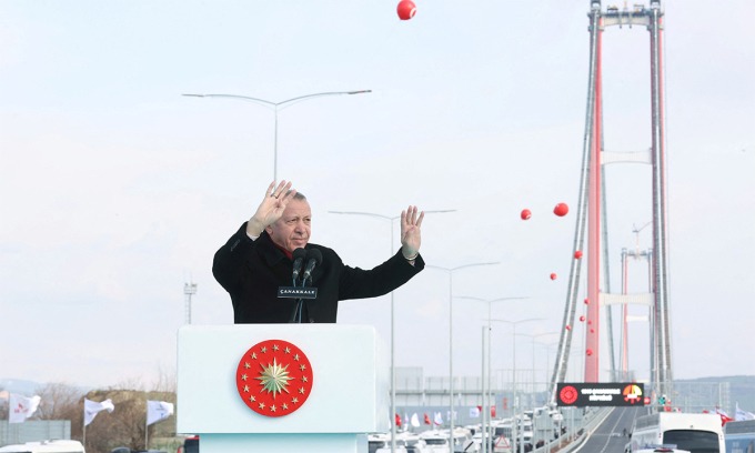 Tổng thống Thổ Nhĩ Kỳ Recep Tayyip Erdogan tại lễ khai trương cầu Canakkale 1915 ngày 18/3. Ảnh: Reuters.