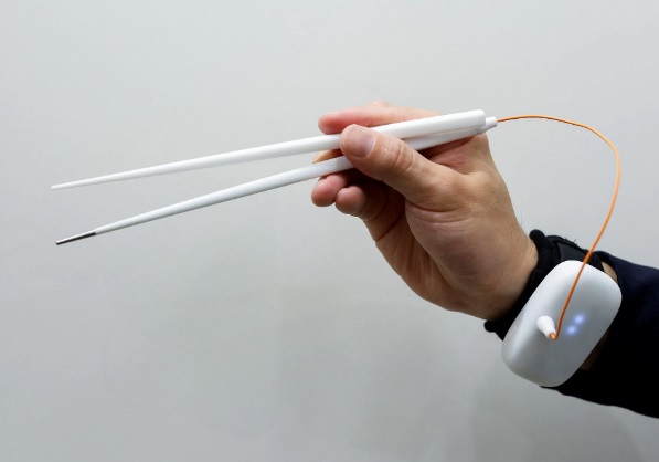Đũa thần kỳ làm tăng cảm giác mặn bằng cách sử dụng kích thích điện và một máy tính mini đeo trên cổ tay.