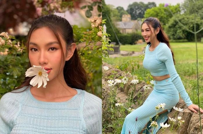 Trong chuyến sang Bồ Đào Nha công tác, Hoa hậu Thùy Tiên mặc crop-top với set đồ tông màu xanh pastel, khoe nhan sắc xinh đẹp và ngọt ngào cùng khung cảnh hoa lá lãng mạn.
