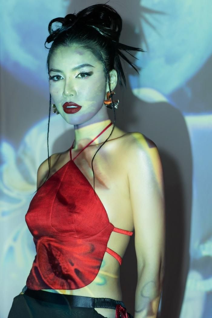 Top 10 Miss Supranational 2018 diện outfit độc đáo của mang tới hình ảnh cá tính, gợi cảm, pha chút nổi loạn và mang vẻ đẹp huyền bí phương Đông. Chiếc áo kiểu dáng yếm đào cắt khoét phần lưng sau giúp cô khoe tấm lưng ngọc ngà, hao gầy.