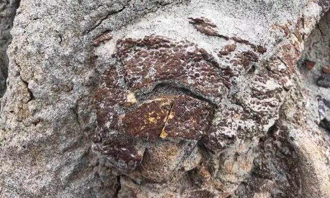 Một phần hóa thạch khủng long mỏ vịt lộ ra khỏi vách đá, cho thấy lớp da với kết cấu sần sùi giống quả bóng rổ.